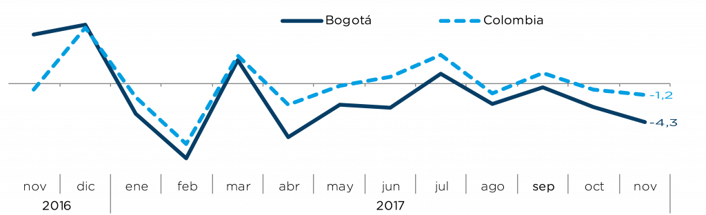 Published in: Boletines Comercio al por menor en Bogotá cayó -4,3% en noviembre Author Observatorio Economico Published on: 31 de enero de 2018 Destacados: Ventas reales minoristasBogotá -4,3%Barranquilla 0,7%Bucaramanga con -4,9%. Archivo de descarga: Boletín comercio al por menor No. 49 Temas:Comercio al por menor Tipo de Publicación: Boletines