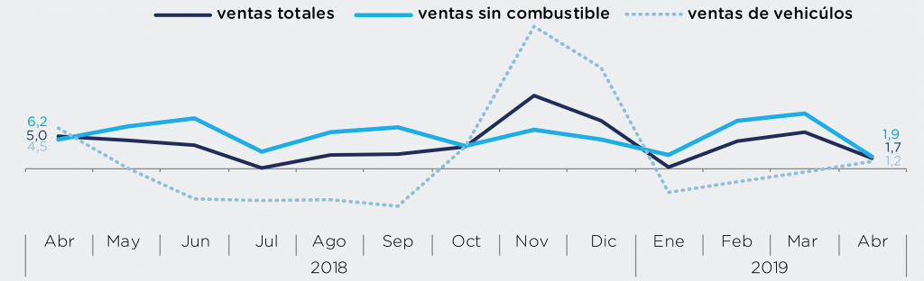 Published in: Boletines Las ventas del comercio minorista caen en abril de 2019 Author Observatorio Economico Published on: 25 de junio de 2019 Destacados: Variacion ventas del comercio minorista abril 2019Medellín 5,3%Barranquilla 3,6%Bogotá 1,7%Cali -0,4%Bucaramanga -1,4% Archivo de descarga: Boletín comercio al por menor No. 65 Temas:Comercio al por menor Tipo de Publicación: Boletines