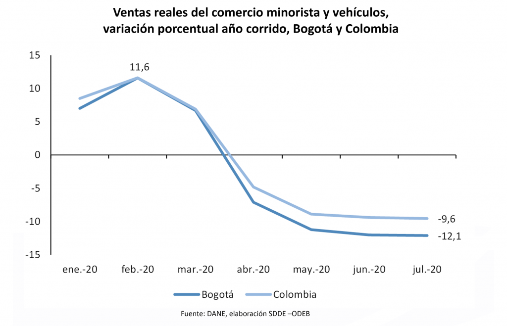 La actividad económica que más influyó en la caída de las ventas en Bogotá en el mes de julio fue vehículos automotores nuevos con una reducción de -35,5% contribuyendo con -13,3 puntos porcentuales (p.p.) en la variación, con respecto a julio de 2019.