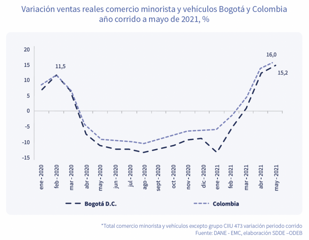 Entre abril y mayo de 2021, el personal ocupado en Bogotá registró una mejoría en 6 de las 7 las actividades comerciales (CIIU Rev. 4), destacándose prendas de vestir y sus accesorios; calzado y artículos sucedáneos al cuero con un avance de 1,4 p.p.