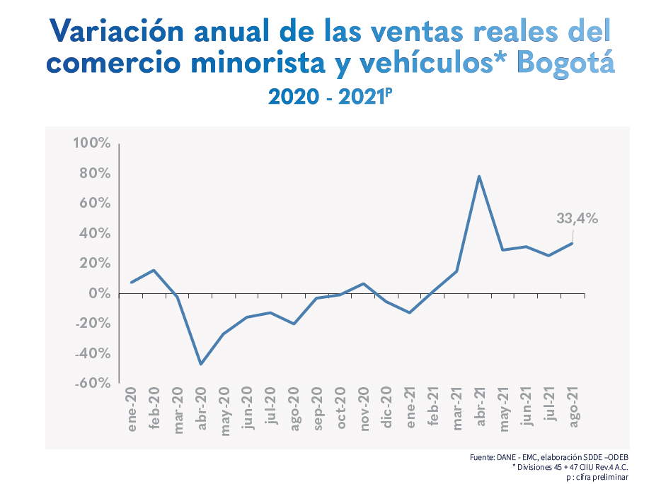 Las ventas reales del comercio al por menor en Bogotá crecieron 33,4 % durante el mes agosto de 2021, frente al mismo periodo de 2020.