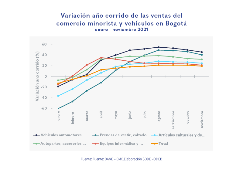 Bogotá aportó 2,0 puntos porcentuales (p.p.) al incremento de 5,6 % de las ventas a nivel nacional.