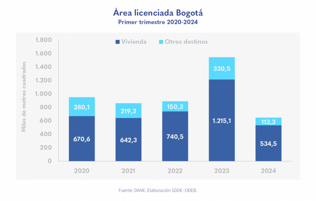 Published in: Boletines El área licenciada en Bogotá en el primer trimestre de 2024 registró el menor valor de los últimos 20 años Author Observatorio Economico Published on: 4 de junio de 2024 Destacados: El área licenciada en Bogotá en marzo fue de 205,1 mil metros cuadrados (m2) y alcanzó un acumulado de 647,8 mil m2 en el primer trimestre de 2024. El número de personas ocupadas en el sector de la construcción en Bogotá creció 10,0 % en el trimestre móvil enero-marzo de 2024. El valor de los insumos importados para construcción registró US$ 38,1 millones CIF. La producción de concreto premezclado con destino a edificaciones no residenciales1 disminuyó. Archivo de descarga: Boletín construcción No. 144 Temas: Construcción Bogotá Tipo de Publicación: Boletines