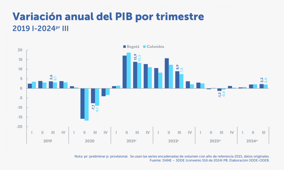Bogotá creció 2,3 % durante el tercer trimestre de 2024pr, 0,3 puntos porcentuales (p.p.) por encima del país cuyo crecimiento fue de 2,0 %.