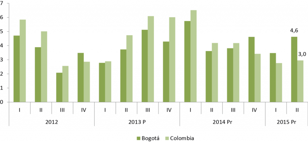 Por tercer trimestre consecutivo, el crecimiento de la economía bogotana es superior a la del país. La economía de Bogotá creció 1,6 puntos porcentuales por encima del crecimiento nacional. El total del Producto Interno Bruto para Bogotá en el segundo trimestre de 2015, asciende a 34,5 billones de pesos a precios constantes de 2005. La construcción se desarrolló cinco veces más en la capital que en el país La industria capitalina no levanta cabeza, registrando tasas negativas en el segundo trimestre de 2015. En el primer semestre del año, la economía subió 4%.