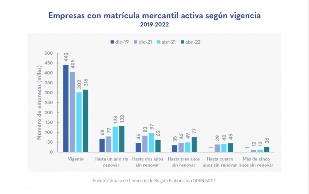 • El tejido empresarial de Bogotá tuvo un incremento de más de 28.000 empresas en abril de 2022, respecto al mismo mes de 2021.