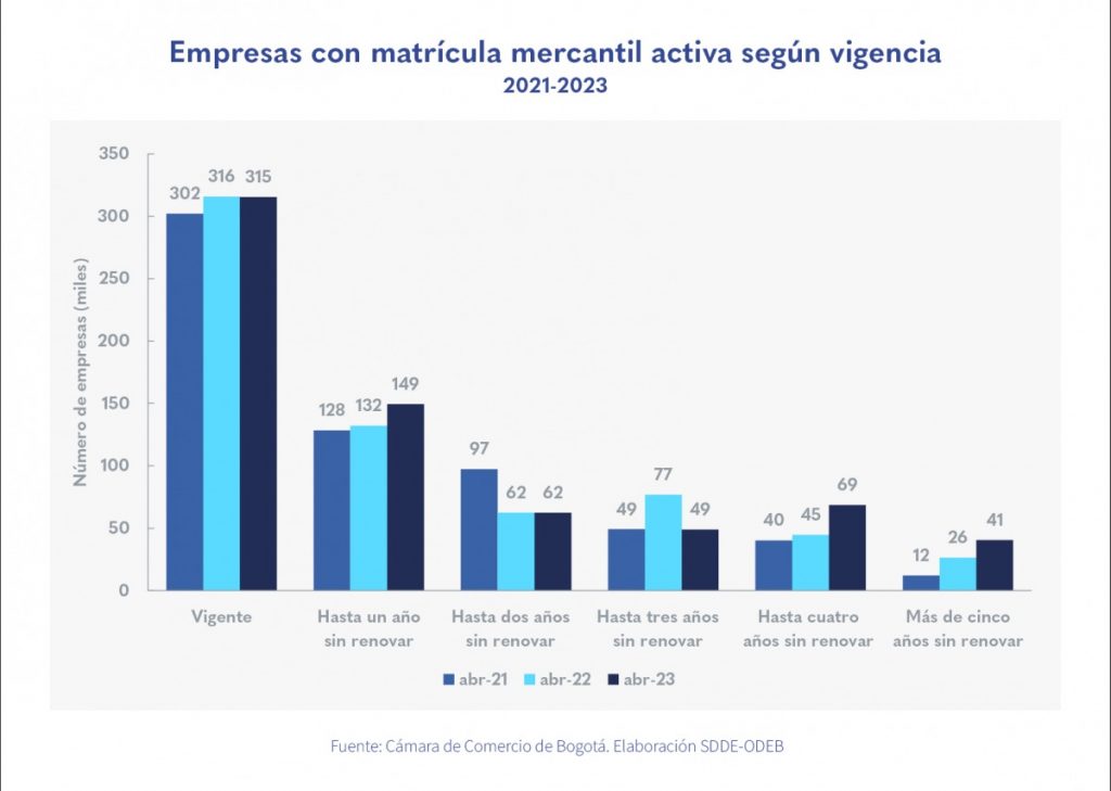 • En abril de 2023, el 46,0 % del tejido empresarial se encontraba al día con la obligación de renovar su matrícula mercantil.