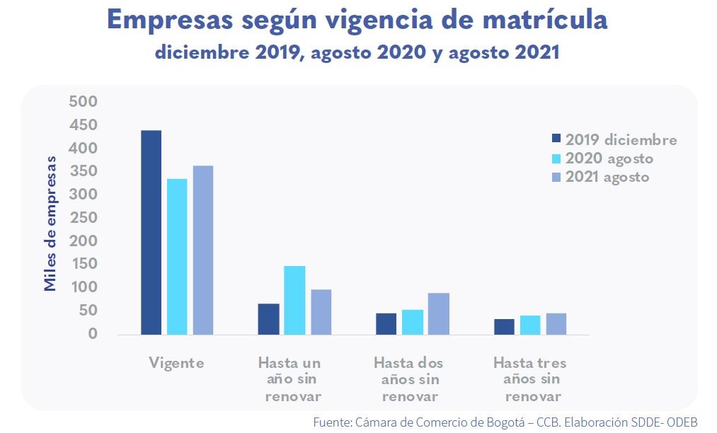A agosto de 2021, la capital registra 363.669 empresas con matrícula vigente, lo que equivale al 56 % del total de las empresas de Bogotá.