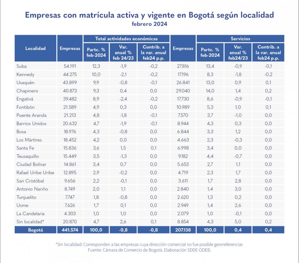 Published in: Boletines En los dos primeros meses de 2024 se crearon 13.972 empresas Author Observatorio Economico Published on: 13 de marzo de 2024 Destacados: Bogotá cerró febrero con 441.574 empresas activas y vigentes1. La participación de las empresas en el sector de servicios fue de 46,9 % respecto al total de empresas activas y vigentes. El 53,8 % de las empresas activas y vigentes fueron personas naturales con registro mercantil. El 42,0 % de las empresas creadas en los dos primeros meses del año fueron lideradas por mujeres. Archivo de descarga: Boletín dinámica empresarial No.33 Temas: Dinámica empresarial. Tipo de Publicación: Boletines