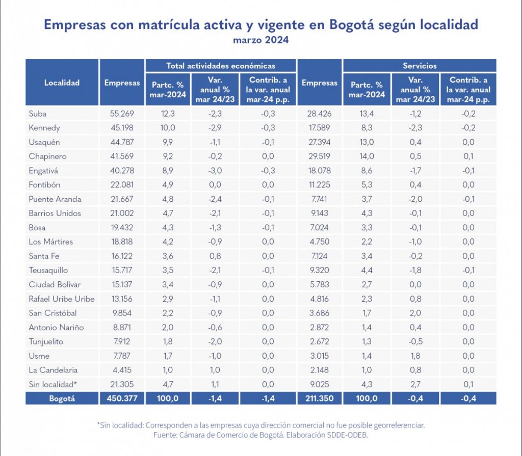 Published in: Boletines En el primer trimestre de 2024 se crearon 19.934 empresas Author Observatorio Economico Published on: 16 de abril de 2024 Destacados: Bogotá cerró marzo de 2024 con 450.377 empresas activas y vigentes1. Para el periodo de análisis, la participación de las empresas del sector servicios en el total de empresas activas y vigentes fue de 46,9 %. El 53,8 % de las empresas activas y vigentes pertenecieron a personas naturales con registro mercantil. El 42,3 % de las empresas creadas en el primer trimestre del 2024 fueron lideradas por mujeres. Archivo de descarga: Boletín dinámica empresarial No.34 Temas: Dinámica empresarial. Tipo de Publicación: Boletines