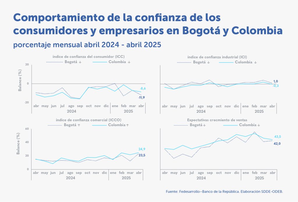 Published in: Boletines En abril de 2025, mejoró la confianza de los comerciantes en Bogotá Author Carlos Andres Casas Peña Published on: 17 de junio de 2025 Destacados: En abril de 2025, las expectativas sobre el volumen de las ventas de los empresarios en la ciudad aumentaron en 1,4 p.p.Para el periodo de análisis, aumentó la disposición a comprar vehículo en 7,7 p.p. en la ciudad. Archivo de descarga: Boletín expectativas No. 118 Temas:Expectativas Tipo de Publicación: Boletines