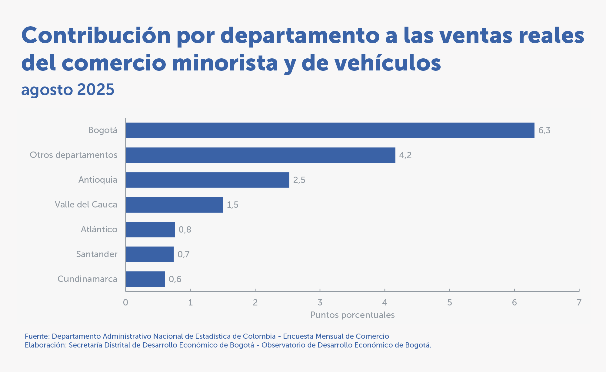 En agosto de 2025, el aumento de las ventas reales en el comercio al por menor en Bogotá estuvo asociado con la división de vehículos automotores nuevos, presentando un aporte de 9,1 p.p.