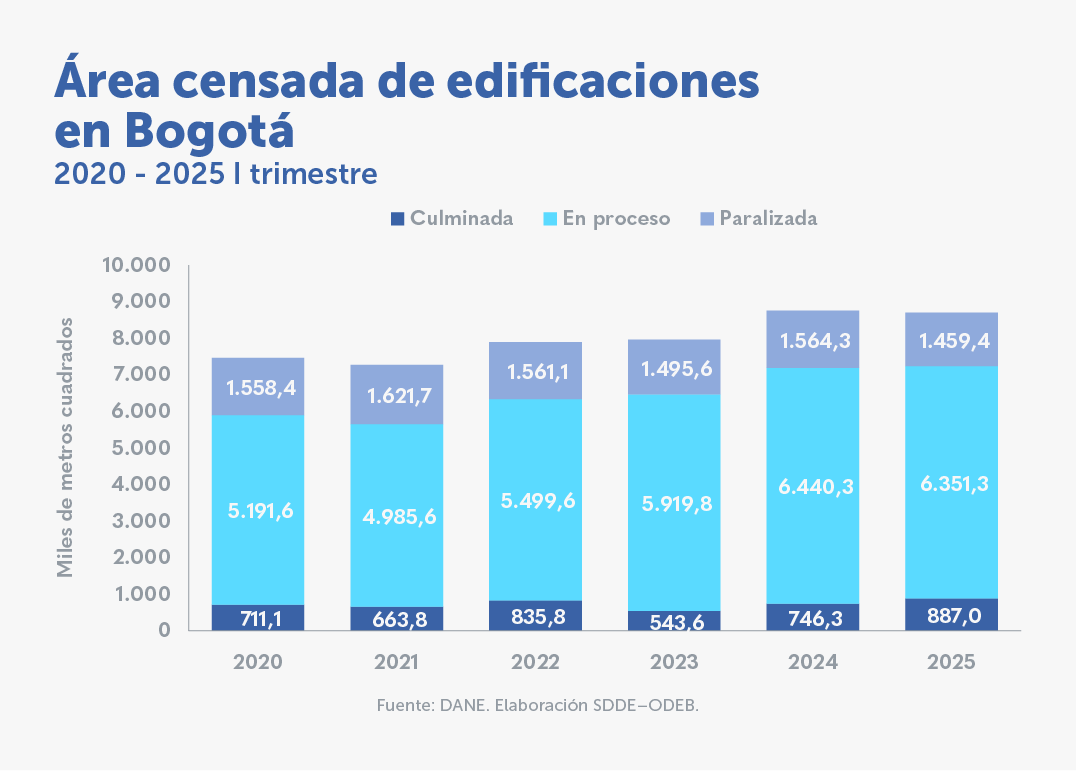 Published in: Boletines En el primer trimestre de 2025 el área culminada de construcción de Bogotá aumentó 18,9 % Author Vladimir Lenin Daza Acosta Published on: 25 de agosto de 2025 Destacados: El área culminada de construcción creció en 140,7 miles m2 respecto al primer trimestre 2024.El área en proceso de construcción disminuyó 1,4 % respecto al 2024.El área paralizada de edificaciones en los municipios1 cercanos a Bogotá disminuyó 8,7%. Archivo de descarga: Boletín construcción regional No.39 Temas: Construcción regional. Tipo de Publicación: Boletines