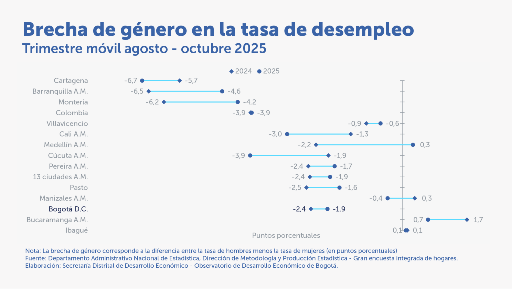 Published in: Boletines En el trimestre agosto – octubre de 2025, la tasa de desempleo de la mujeres fue de un dígito (8,7 %) Author Federico Alberto Valdeblanquez Prieto Published on: 16 de diciembre de 2025 Destacados: En el trimestre agosto – octubre de 2025, se presentó un aumento de 71.324 mujeres ocupadas.La tasa de desempleo (TD) de la población joven disminuyó 4,3 (p.p.) respecto al mismo periodo del año anterior. Archivo de descarga: Boletín mercado laboral especial No.133 Temas: Mercado laboral especial. Tipo de Publicación: Boletines