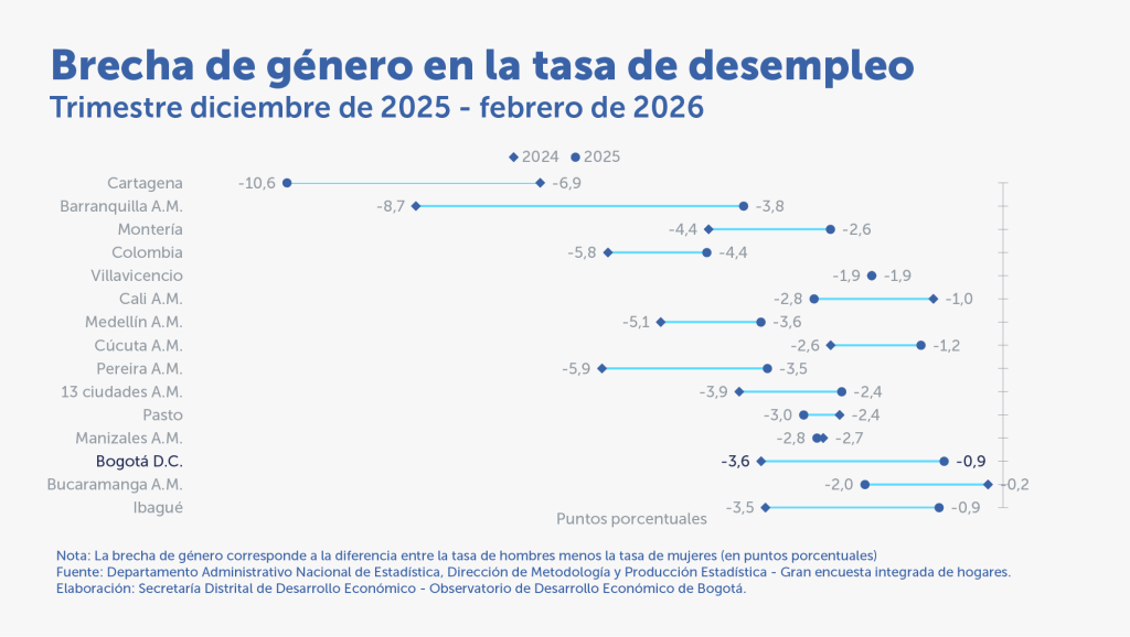 Published in: Boletines En el trimestre diciembre de 2025 – febrero de 2026, el desempleo de las mujeres disminuyó en 72.085personas Author Federico Alberto Valdeblanquez Prieto Published on: 17 de abril de 2026 Destacados: En el trimestre diciembre de 2025 – febrero de 2026, disminuyó la tasa de desempleo de mujeres y hombres.La ocupación entre la población joven disminuyó en 52.852 personas, respecto al mismo periodo del año anterior. Archivo de descarga: Boletín mercado laboral especial No.137 Temas: Mercado laboral especial. Tipo de Publicación: Boletines