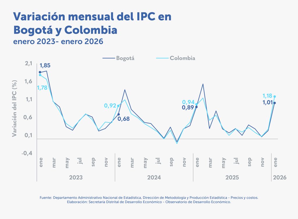 Published in: Boletines En enero de 2026, la inflación mensual de Bogotá fue de 1,01 % Author Federico Alberto Valdeblanquez Prieto Published on: 11 de febrero de 2026 Destacados: La inflación en enero de 2026 estuvo 0,12 puntos porcentuales (p.p.) por encima de la del mismo mes del año inmediatamente anterior (0,89 %).La inflación anual de la capital fue de 5,54 %, 0,19 p.p. por encima de la de Colombia (5,35 %).En restaurantes y hoteles, así como en transporte se presentaron los mayores incrementos mensuales. Archivo de descarga: Boletín inflación No.177 Temas: Inflación y gasto. Tipo de Publicación: Boletines