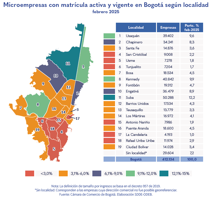 Published in: Boletines En febrero 2025, el 52,8 % de las empresas vigentes fueron personas naturales Author Observatorio Economico Published on: 20 de marzo de 2025 Destacados: Bogotá cerró febrero de 2025 con 444.163 empresas activas y vigentes1.Para el periodo de análisis, la participación de las empresas del sector servicios en el total de empresas activas y vigentes fue de 47,3 %.El 52,8 % de las empresas activas y vigentes pertenecieron a personas naturales con registro mercantil.En febrero las empresas creadas por mujeres representaron 43,1 %. Archivo de descarga: Boletín dinámica empresarial No.45 Temas: Dinámica empresarial. Tipo de Publicación: Boletines