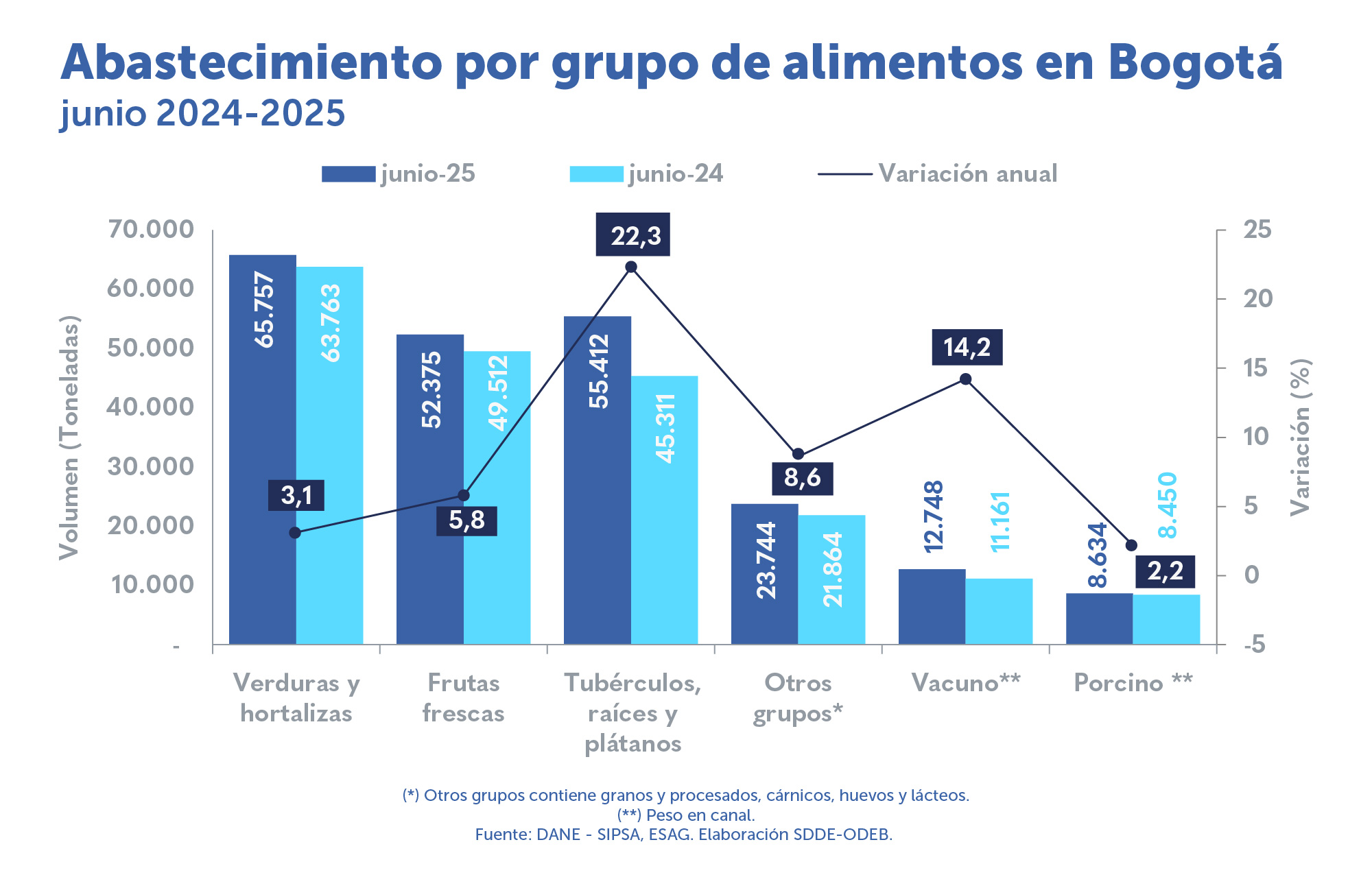 • En junio de 2025, el abastecimiento per cápita de alimentos en Bogotá fue de 27,5 kilogramos por habitante (kg/hab), los que representa un aumento del 9,2 % frente al mismo mes de 2024.