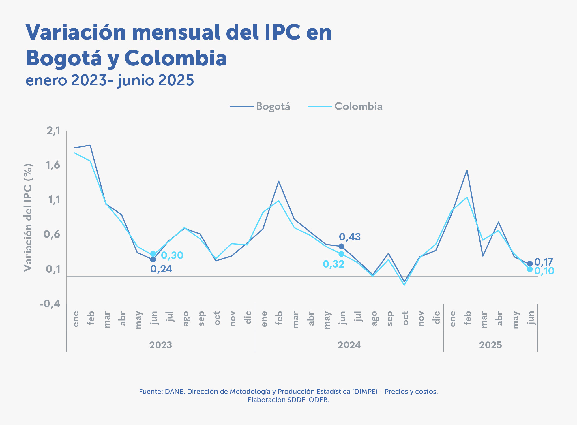 Published in: Boletines En junio de 2025, la inflación mensual en la ciudad fue 0,17 %, manteniendo su tendencia descendente Author Carlos Andres Casas Peña Published on: 14 de julio de 2025 Destacados: La inflación en junio de 2025 mostró una reducción de 0,26 puntos porcentuales (p.p.) respecto a junio de 2024 (0,43%).La inflación anual en Bogotá cerró en 5,20 %, lo que representa 2,2 p.p. por debajo del mismo periodo del año anterior (7,44 %).Los mayores aumentos mensuales se registraron en las divisiones de restaurantes y hoteles y transporte. Archivo de descarga: Boletín inflación No.170 Temas: Inflación y gasto. Tipo de Publicación: Boletines