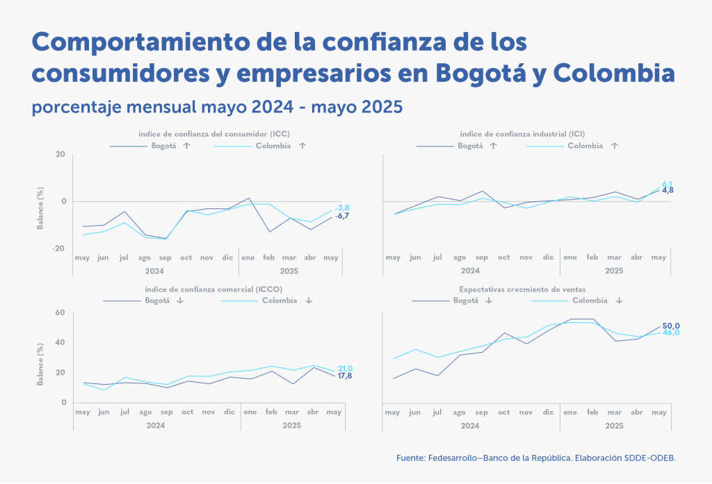 Published in: Boletines En mayo de 2025, mejoró la confianza de los consumidores en Bogotá Author Carlos Andres Casas Peña Published on: 7 de julio de 2025 Destacados: En mayo de 2025, las expectativas sobre el volumen de las ventas de los empresarios en la ciudad aumentaron en 8,0 puntos porcentuales (p.p.).En el quinto mes del año, la confianza de los industriales en Bogotá incremento 3,8 p.p.Para el periodo de análisis, aumentó la disposición a comprar vehículo en 2,3 p.p. en la ciudad. Archivo de descarga: Boletín expectativas No. 119 Temas:Expectativas Tipo de Publicación: Boletines