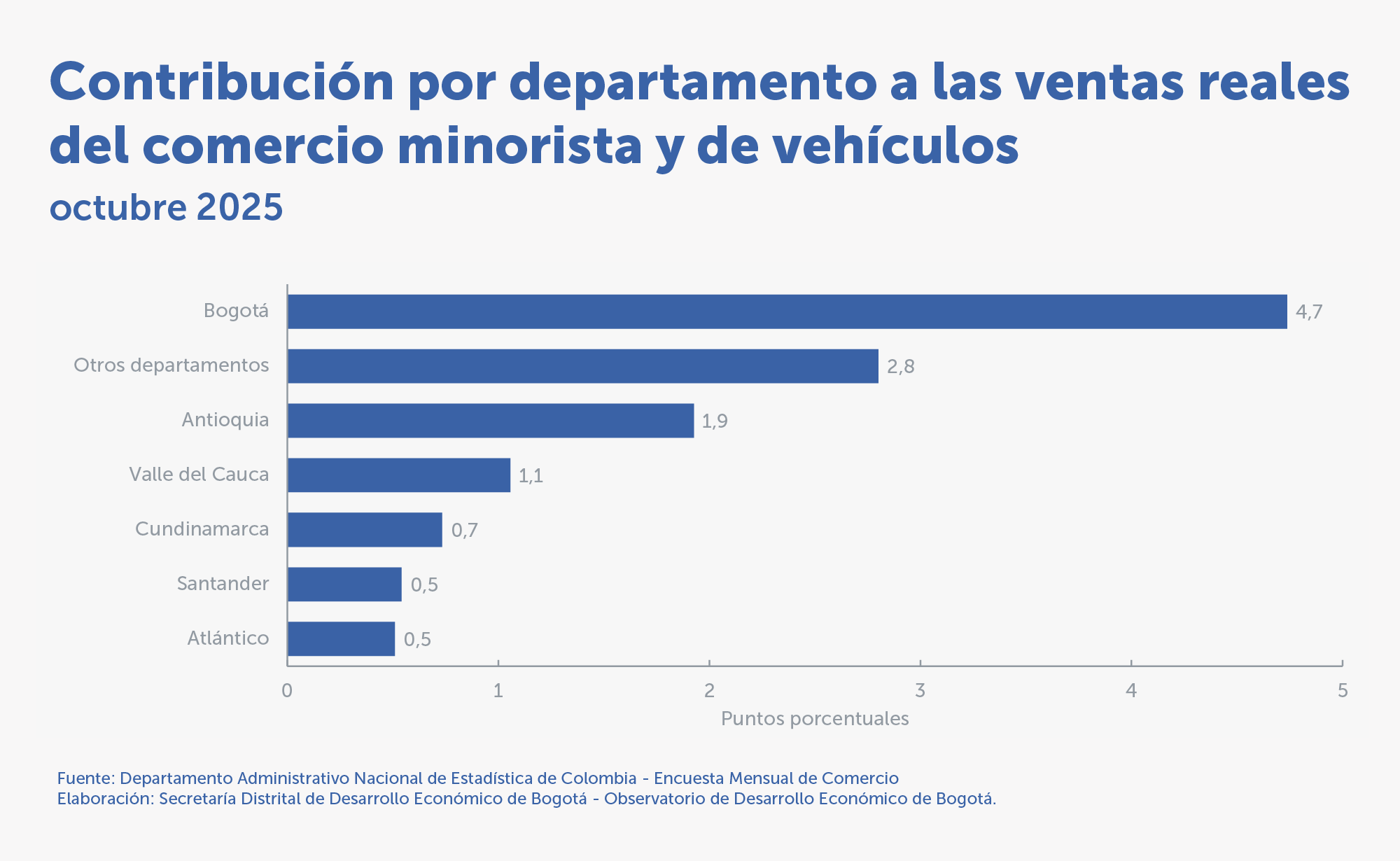 En octubre de 2025, el aumento de las ventas reales en el comercio al por menor en Bogotá estuvo asociado con la división de vehículos automotores nuevos, presentando un aporte de 6,6p.p.