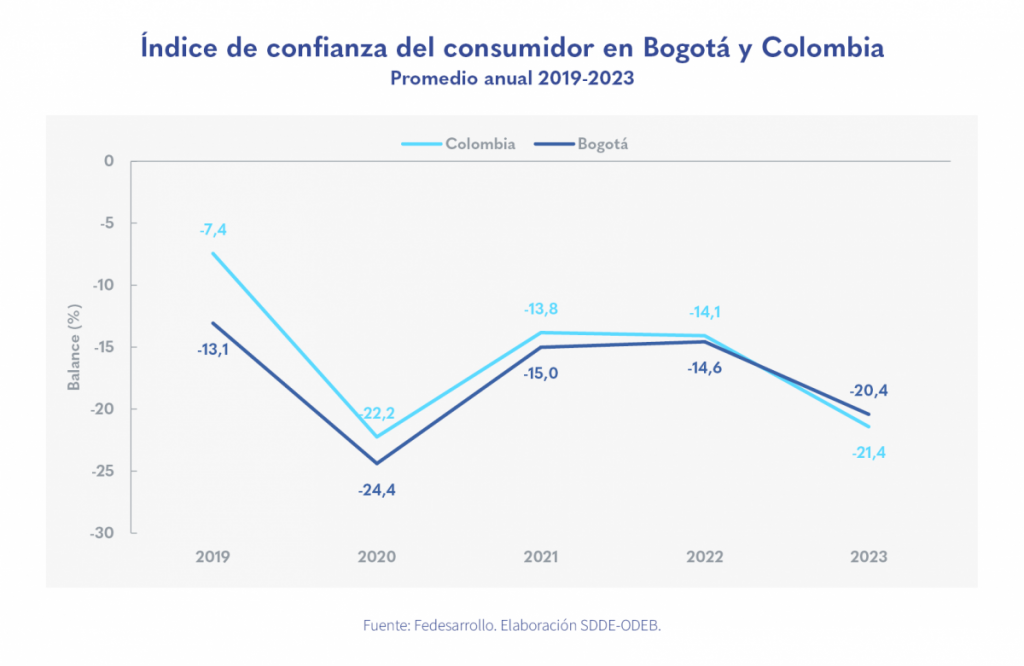 • El Índice de confianza de los consumidores (ICC) en Bogotá se mantuvo negativo durante todo el año y su promedio anual registró 5,9 puntos porcentuales (p.p.) menos que el año anterior.