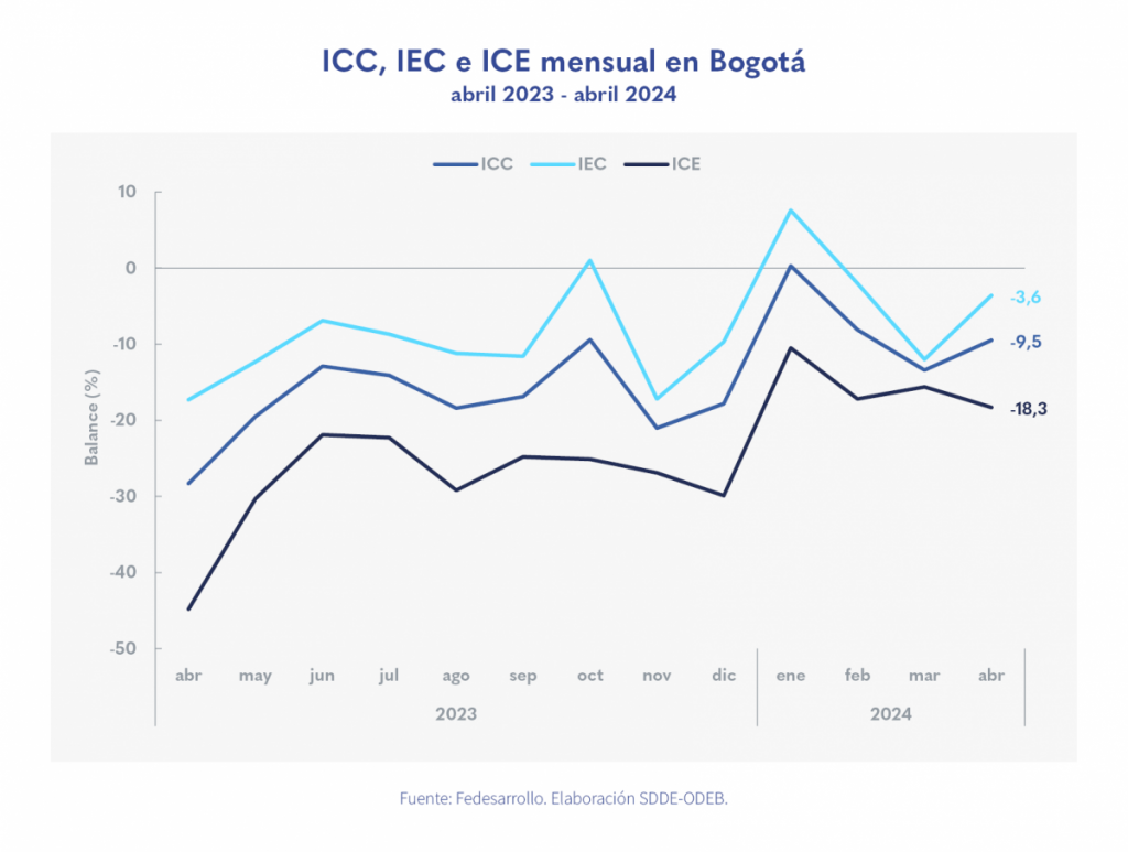 • El Índice de confianza de los consumidores (ICC) en Bogotá y en Colombia aumentó en 3,9 y 1,6 puntos porcentuales (p.p.), respectivamente en comparación con el mes de marzo de 2024.