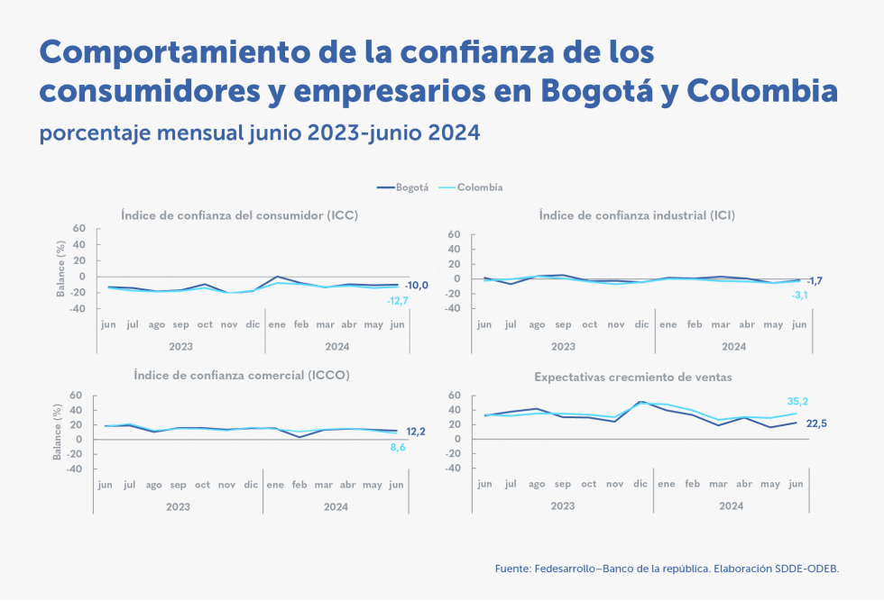 • El Índice de confianza de los consumidores (ICC) en Bogotá fue superior al del país en 2,7 puntos porcentuales (p.p.) para el mes de junio 2024.