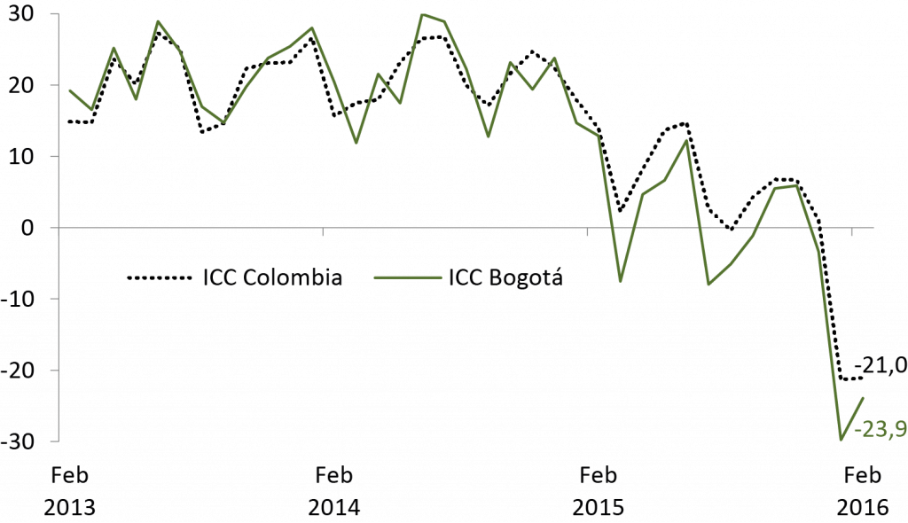La percepción de la situación económica actual (ICE) se mantiene negativa en la capital. En febrero de 2016 se situó en –33%, más baja que la de Colombia (-30%).