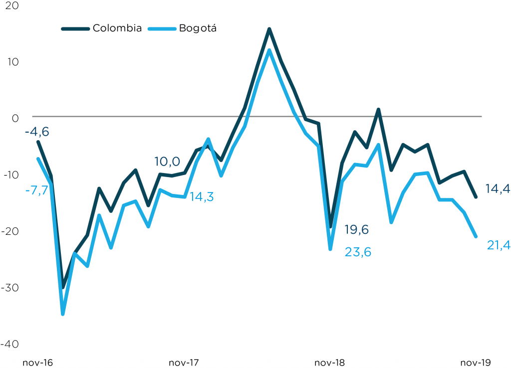 Published in: Boletines Confianza de los consumidores en noviembre se ubicó en -21,4% Author Observatorio Economico Published on: 5 de febrero de 2020 Destacados: Para la nación, el indicador para el mes de noviembre fue -14,4%, situando a Bogotá por debajo de esta y reflejando la disminución de la confianza de sus habitantes. Archivo de descarga: Boletín expectativas No. 57 Temas:Expectativas Tipo de Publicación: Boletines