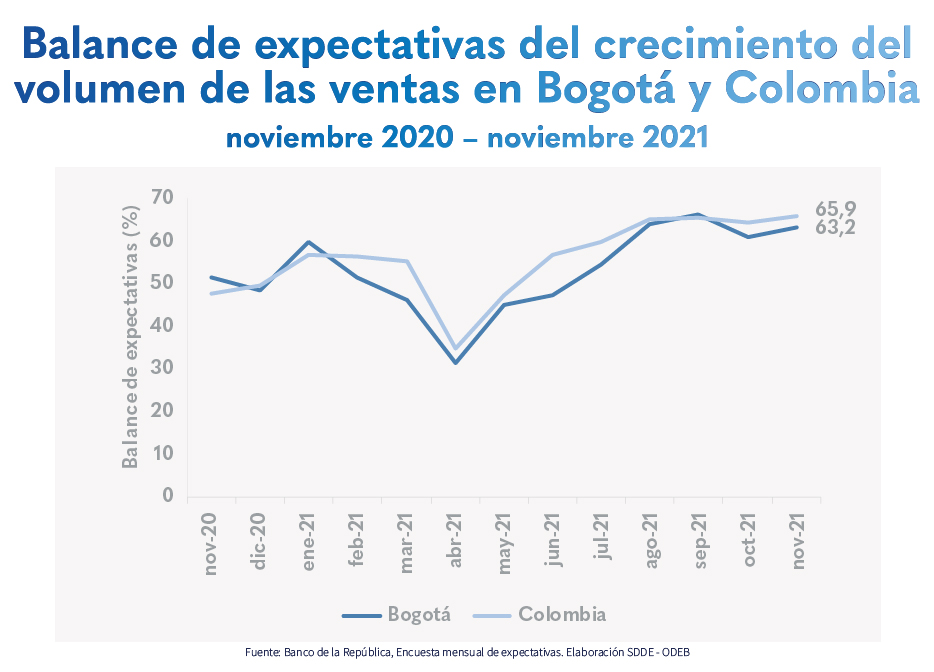 El balance1 de opinión en las expectativas del volumen de ventas para los próximos doce meses en Bogotá, subió 2,1 puntos porcentuales (p.p.) en el último mes.