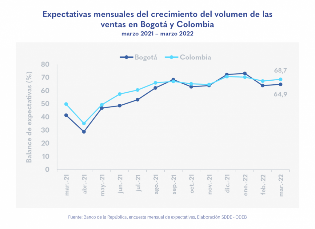 El balance1 de opinión en las expectativas del volumen de ventas para los próximos doce meses en Bogotá fue de 64,9 %, reflejando un aumento de 0,9 puntos porcentuales p.p., en comparación con febrero 2022 (64,0 %).