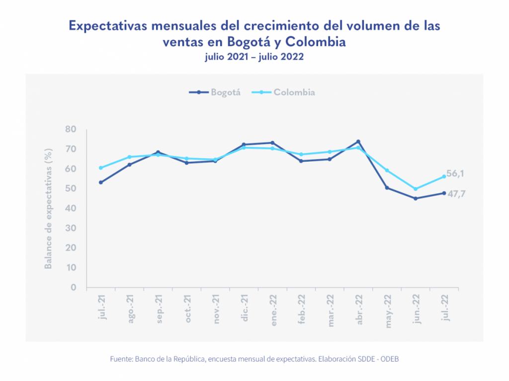 El balance de opinión en las expectativas del volumen de ventas para los próximos doce meses en Bogotá fue de 47,7 %, reflejando un crecimiento de 2,7 p.p. (puntos porcentuales) en comparación con junio 2022 (45,0 %)1.