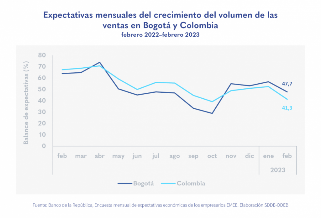 • En febrero de 2023, el balance de opinión en las expectativas del volumen de ventas para los próximos doce meses en Bogotá fue de 47,7 %1