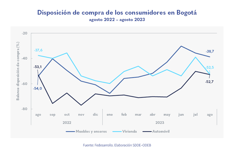 • En agosto de 2023, la disposición a comprar1 muebles y enseres en la ciudad aumentó en 15,3 puntos porcentuales (p.p.) respecto al mismo mes de 2022.
