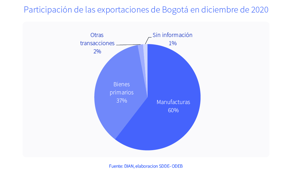 Published in: Boletines En diciembre de 2020, Bogotá incrementó sus exportaciones 15,2 % frente al mismo mes de 2019 Author Observatorio Economico Published on: 2 de marzo de 2021 Destacados: Las exportaciones de Bogotá aportaron US$ 216,3 millones en el último mes del 2020 Los productos manufacturados registraron el 60 % de participación e impacto en las exportaciones de la ciudad. Estados Unidos, Ecuador, México y Perú, fueron los principales socios comerciales en 2020. Archivo de descarga: Boletín exportaciones No. 115 Temas: Exportaciones Tipo de Publicación: Boletines