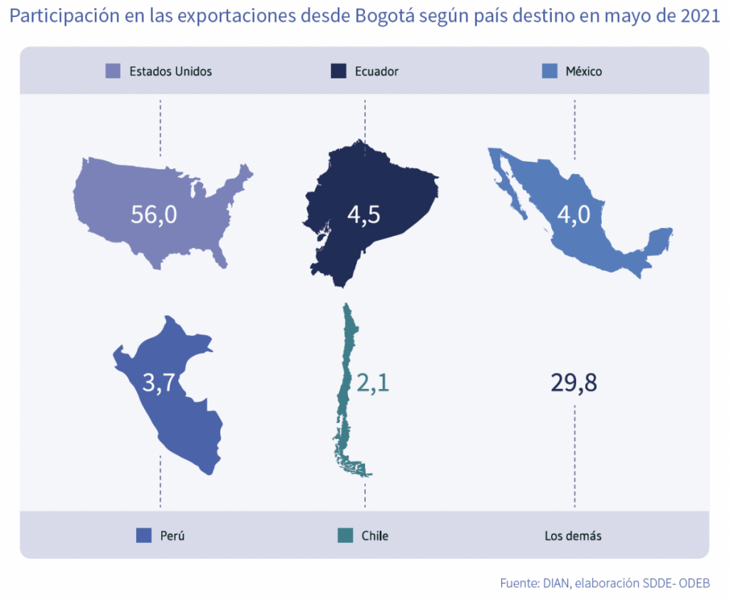 Published in: Boletines EE.UU. se consolidó como el principal destino de las exportaciones de Bogotá con US$ 131,7 millones en mayo Author Observatorio Economico Published on: 29 de julio de 2021 Destacados: Año corrido a mayo, las exportaciones desde la capital sumaron US$ 1.242,5 millones.La actividad de agricultura representó casi la mitad de las exportaciones de mayo con 49,8 %.Los capullos frescos, fue el producto con mayor valor exportado con US$ 64,9 millones.Respecto a 2019, año prepandemia, las exportaciones crecieron 2,2 %. Archivo de descarga: Boletín exportaciones No. 120 Temas: Exportaciones Tipo de Publicación: Boletines