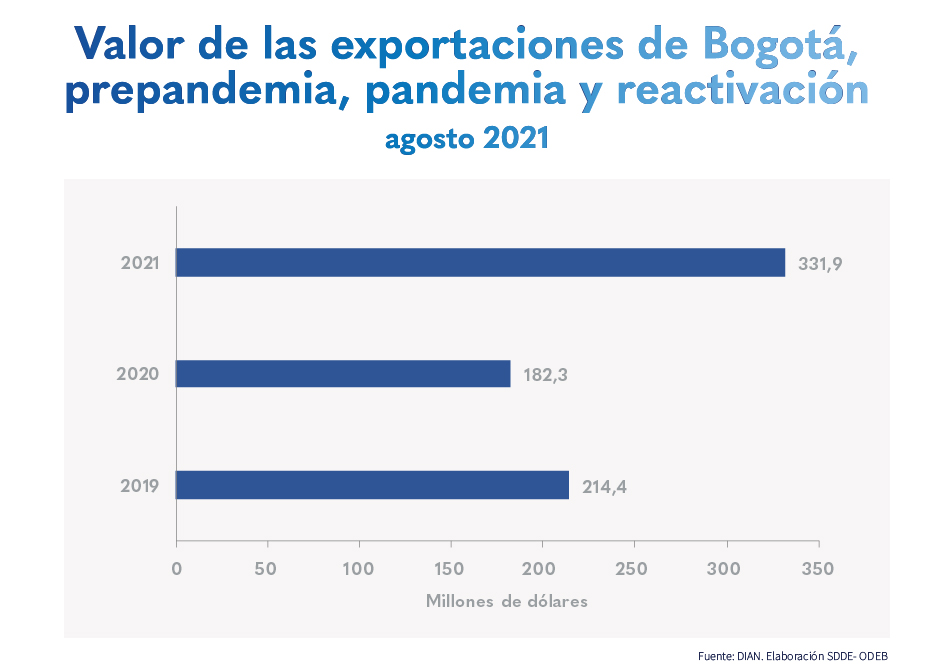 Published in: Boletines Reactivación económica: las exportaciones de Bogotá superan las cifras prepandemia Author Observatorio Economico Published on: 29 de octubre de 2021 Destacados: ● En agosto de 2021 la cifra de exportaciones fue 54,8 % superior a la registrada en agosto de 2019, año prepandemia.● Los productos manufacturados fueron mayoría en ventas al exterior, especialmente los de alta tecnología con un 28,3 % de participación.● Los cafés sin tostar con 14,1 % y ventas por US$ 46,8 millones, representaron el producto con mayor aporte a las exportaciones del mes. Archivo de descarga: Boletín exportaciones No. 123 Temas: Exportaciones Tipo de Publicación: Boletines