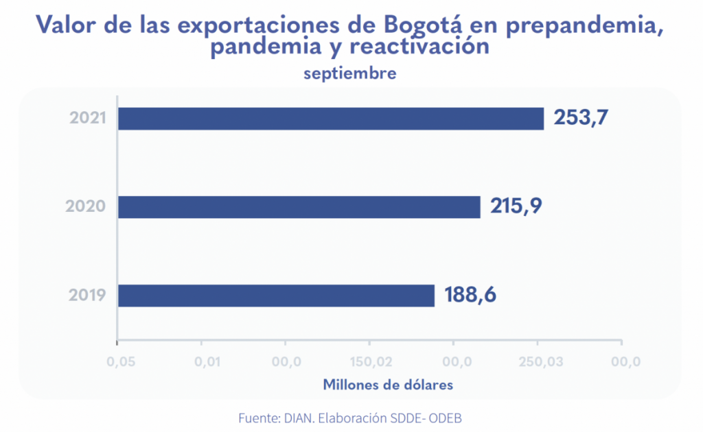 Published in: Boletines Las ventas de Bogotá en el exterior superaron en 34,4 % a las registradas en septiembre del 2019, año prepandemia Author Observatorio Economico Published on: 7 de diciembre de 2021 Destacados: El 66,3 % de las exportaciones fueron productos manufacturados, con una participación de 28,3 % de los de tecnología media.Las exportaciones no tradicionales fueron el 86,4 % de las exportaciones.Bogotá contribuyó con el 7,1 % de las ventas al exterior del país. Archivo de descarga: Boletín exportaciones No. 124 Temas: Exportaciones Tipo de Publicación: Boletines
