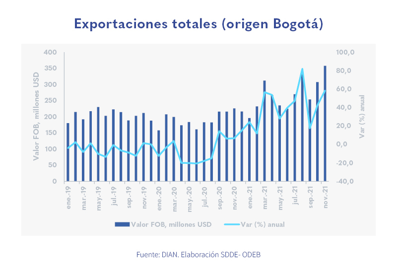 Published in: Boletines Bogotá lidera las exportaciones colombianas de alta tecnología Author Observatorio Economico Published on: 9 de febrero de 2022 Destacados: Las manufacturas bogotanas en el año corrido a noviembre de 2021, representaron 42,3 % de las exportaciones de alta tecnología del país.Las exportaciones de alimentos en noviembre presentaron gran dinamismo, registrando un crecimiento de 175,7 % frente al mismo período de 2020. Las ventas al exterior desde Bogotá alcanzaron los U$357,8 millones, 58,4 % más que las registradas en noviembre de 2020.Estados Unidos fue el principal destino de las exportaciones bogotanas, con una participación del 33,3 %. Archivo de descarga: Boletín exportaciones No. 126 Temas: Exportaciones Tipo de Publicación: Boletines