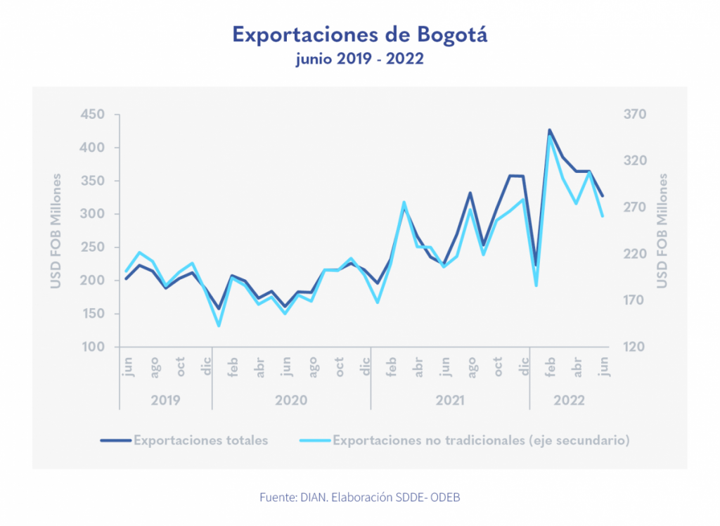 Published in: Boletines A junio de 2022, exportaciones de la ciudad aumentaron 42,6 % Author Observatorio Economico Published on: 7 de septiembre de 2022 Destacados: En el primer semestre de 2022, las exportaciones de la ciudad crecieron 42,6 % frente al mismo periodo de 2021.Equipos de transporte, fue la actividad que reportó la variación más alta en la primera mitad de 2022 con 267,6 %.Estados Unidos, fue el principal destino de las exportaciones en junio, con ventas de USD FOB 134,8 y una participación de 41,1 % del total.En lo corrido del año 2022, las manufacturas bogotanas representaron 41,6 % de las exportaciones de alta tecnología del país. Archivo de descarga: Boletín exportaciones No. 129 Temas: Exportaciones Tipo de Publicación: Boletines
