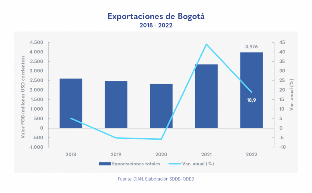 Published in: Boletines Exportaciones de Bogotá aumentaron 18,9 % en 2022 Author Observatorio Economico Published on: 1 de marzo de 2023 Destacados: Respecto a 2021, las exportaciones de bienes de Bogotá aumentaron tanto en el segmento tradicional (54,2 %) como en el no tradicional (12,3 %). Las exportaciones de bienes primarios aumentaron 35,1 % y representaron el 45,2 % del total exportado por la ciudad en 2022. Las manufacturas tuvieron un incremento de 5,0 % en 2022, explicado principalmente por mayores ventas en el segmento de alta tecnología. Archivo de descarga: Boletín exportaciones No. 135 Temas: Exportaciones Tipo de Publicación: Boletines
