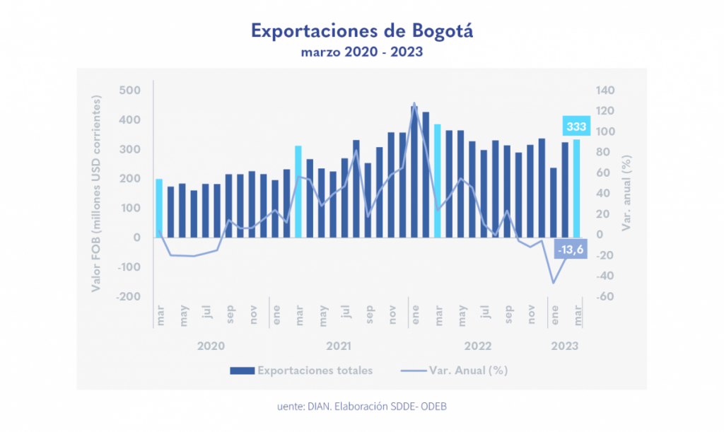 En comparación a marzo de 2022, las exportaciones totales de Bogotá disminuyeron 13,6 %, debido a la caída en el segmento de bienes primarios (-21,5 %).