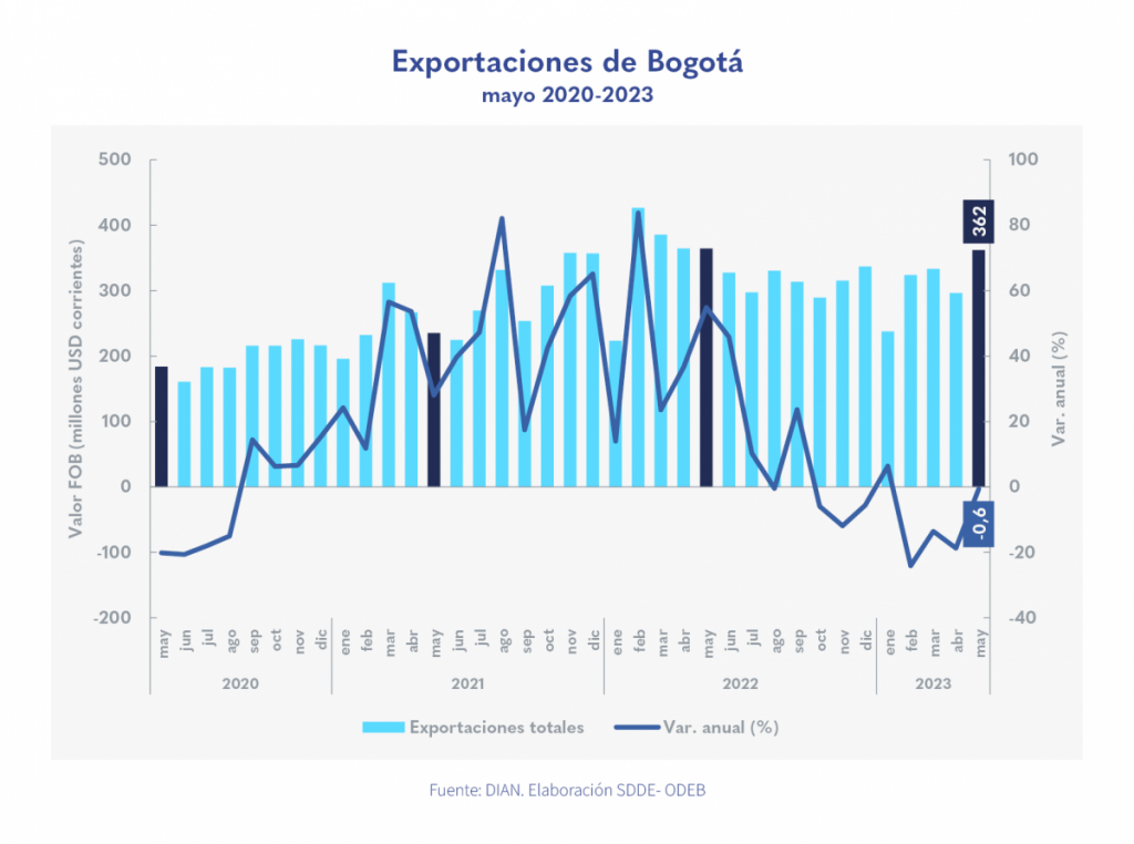 En comparación con mayo de 2022, las exportaciones totales de Bogotá disminuyeron 0,6 %, debido principalmente a menores ventas externas de bienes primarios (-12,9 %).