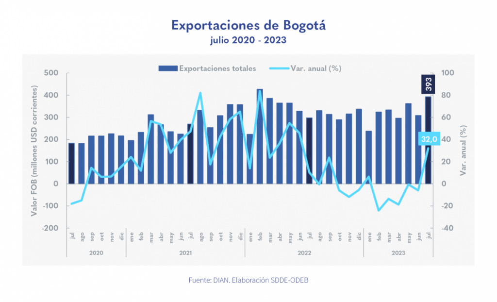En comparación a julio de 2022, las exportaciones totales de bienes de Bogotá crecieron 32,0 %, debido principalmente a mayores ventas externas de bienes primarios (37,5 %).