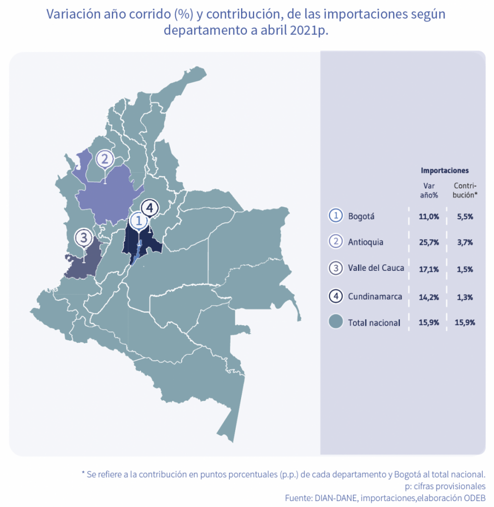 Bogotá aportó 5,5 p.p. al crecimiento de 15,9 % de las importaciones que ingresaron al territorio nacional año corrido a abril de 2021.