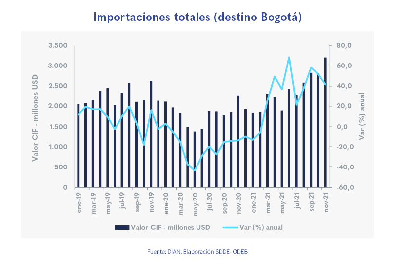 Published in: Boletines Las importaciones de Bogotá alcanzan su mayor nivel en los últimos 5 años Author Observatorio Economico Published on: 9 de febrero de 2022 Destacados: En noviembre de 2021 la ciudad importó US$ 3.208 millones, la cifra más alta en los últimos cinco años.Las importaciones de combustibles impulsaron el crecimiento en noviembre, con una variación de 230,2 %.Estados Unidos y China fueron el origen de la mayoría de las mercancías importadas, con una participación conjunta de 53,3 % en el mes. Archivo de descarga: Boletín Importaciones No. 117 Temas: Importaciones Tipo de Publicación: Boletines