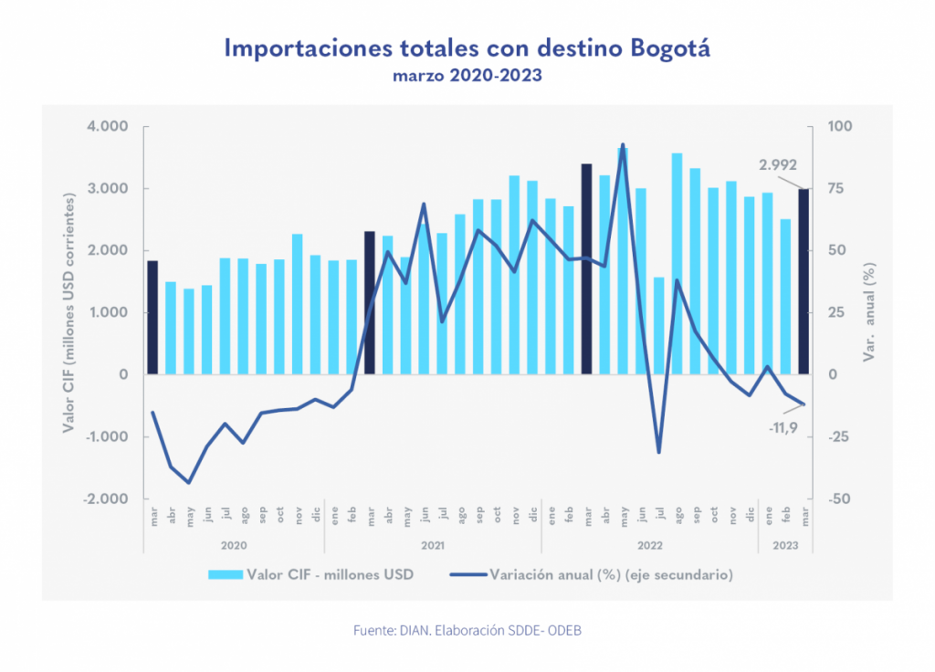 La ciudad importó US$ 2.992 millones en marzo de 2023, cayendo 11,9 % frente al mismo mes del año 2022.