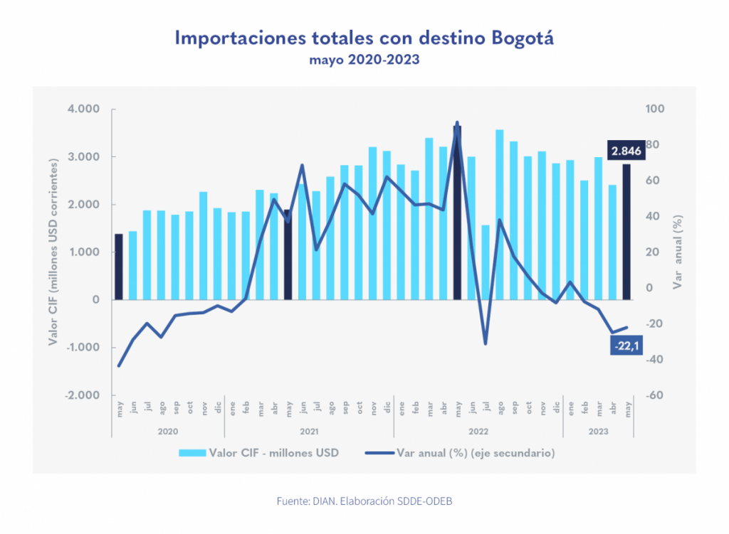 Published in: Boletines En mayo de 2023 las importaciones de bienes primarios aumentaron 27,9 % Author Observatorio Economico Published on: 1 de agosto de 2023 Destacados: Las importaciones de la ciudad en mayo de 2023 cayeron 22,1 % frente al mismo mes de 2022. Las importaciones de bienes primarios aumentaron 27,9 %, en contraste las importaciones de manufacturas disminuyeron 25,0 %. La reducción en las compras externas estuvo asociada a una disminución de 11,6 % en el déficit comercial de Bogotá a mayo de 2023. Archivo de descarga: Boletín Importaciones No. 131 Temas: Importaciones Tipo de Publicación: Boletines
