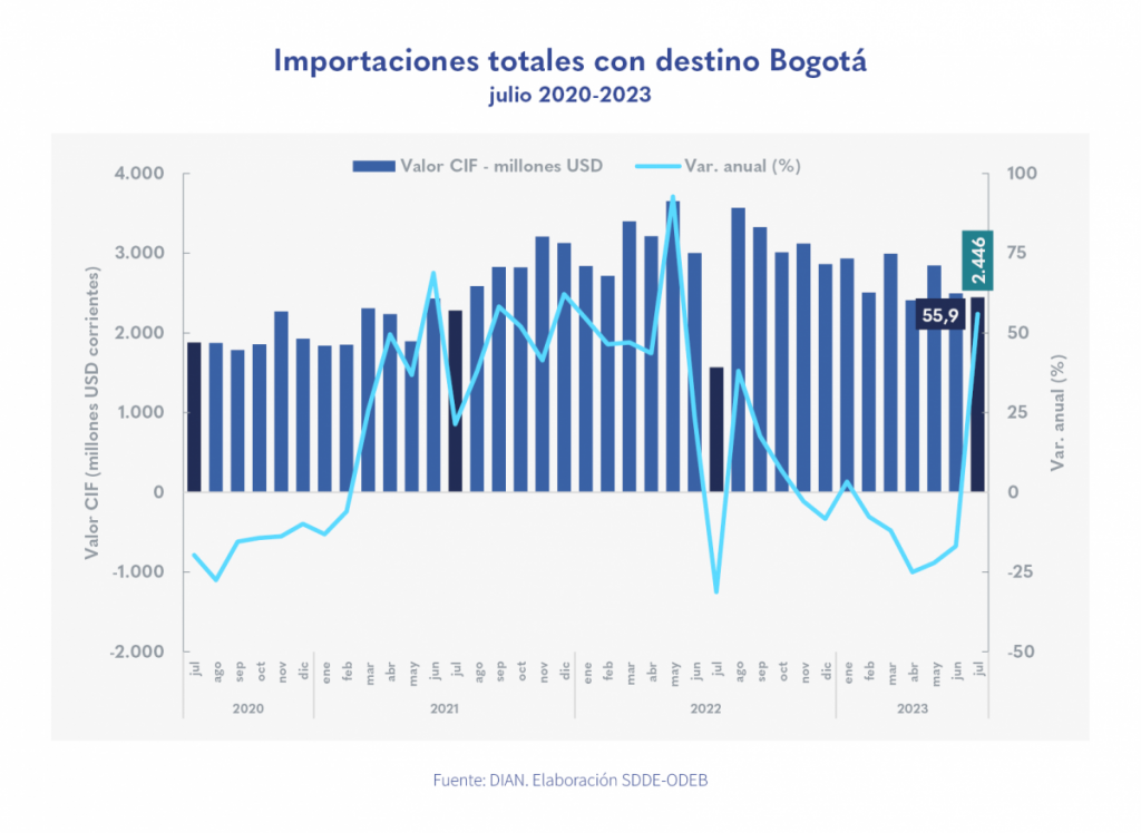 Published in: Boletines En julio las importaciones de Bogotá aumentaron 55,9 % Author Observatorio Economico Published on: 3 de octubre de 2023 Destacados: Las importaciones de bienes de la ciudad en julio de 2023 crecieron 55,9 % frente a julio de 2022. Las importaciones de bienes primarios y de manufacturas aumentaron 90,2 % y 53,7 %, respectivamente. El aumento en las compras externas estuvo explicado en buena parte por el incremento en las importaciones de productos farmacéuticos y vehículos. Archivo de descarga: Boletín Importaciones No. 133 Temas: Importaciones Tipo de Publicación: Boletines